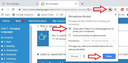 5. Also, you need to give permision to use your microphone. In Chrome, see the three steps below.